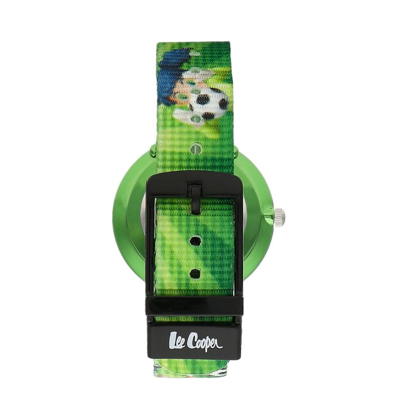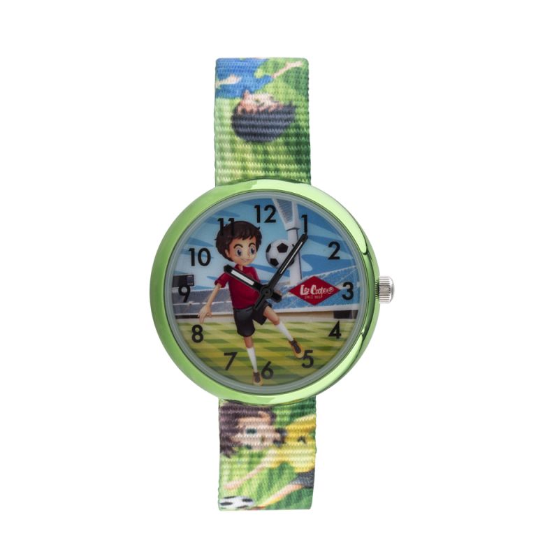 Детски часовник Lee Cooper с цветен дизайн на тема футбол. Моделът е с аналогов дисплей и минерално стъкло. Корпус от поликарбонат, съчетан с текстилна каишка. Задвижва се от кварцов механизъм. Водоустойчивост 3 ATM - допускат се леки пръски, не се препоръчва обилно мокрене.