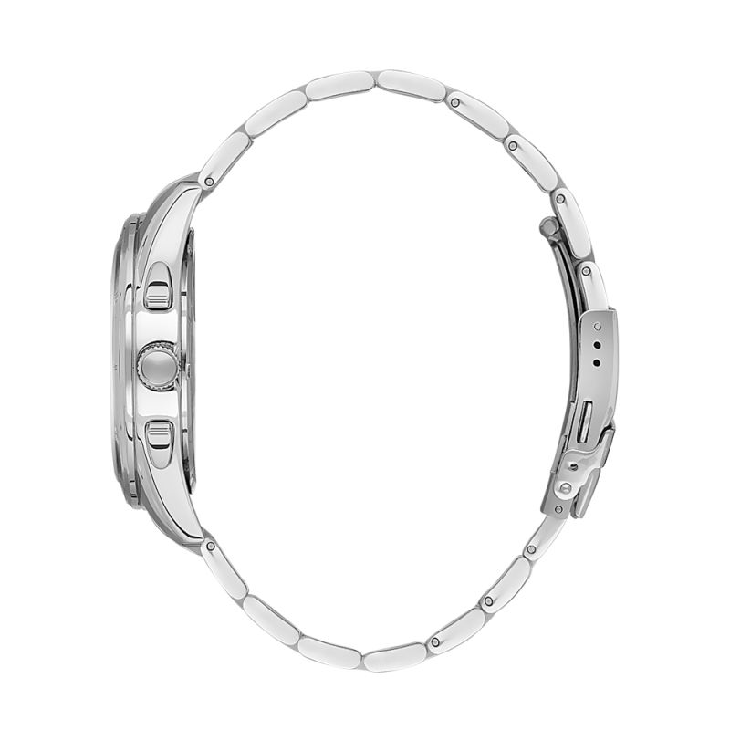 Спортно-елегантен мъжки часовник с мултифункционален дисплей. Метален корпус съчетан с верижка от неръждаема стомана. Стъкло минерал-кристал. Часовникът се задвижва от кварцов механизъм. Водоустойчивост 5 ATM - допускат се леки пръски и взимане на душ, не се препоръчва обилно мокрене.