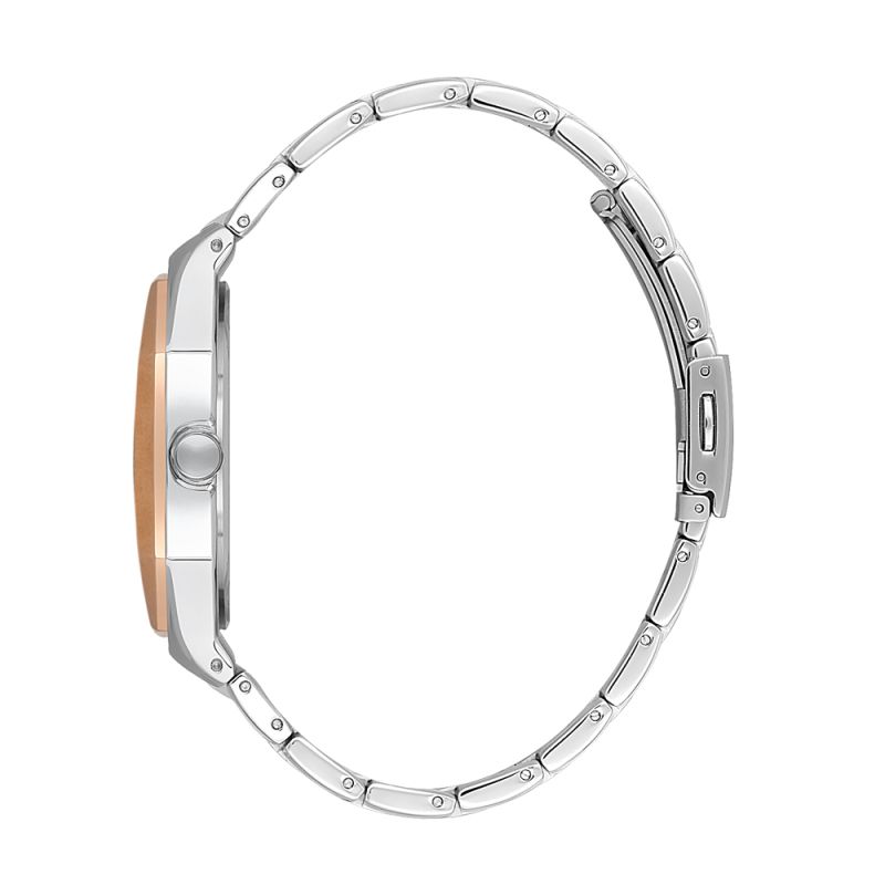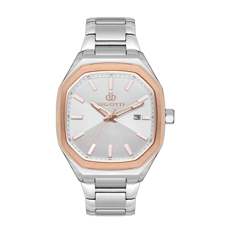 Класически модел мъжки часовник Bigotti с квадратен дизайн. Метален корпус в комбинация с верижка от неръждаема стомана. Сребрист аналогов дисплей с показател за дата. Стъкло минерал-кристал. Задвижва се от кварцов механизъм. Водоустойчивост 5 ATM - допускат се леки пръски и взимане на душ, не се препоръчва обилно мокрене.