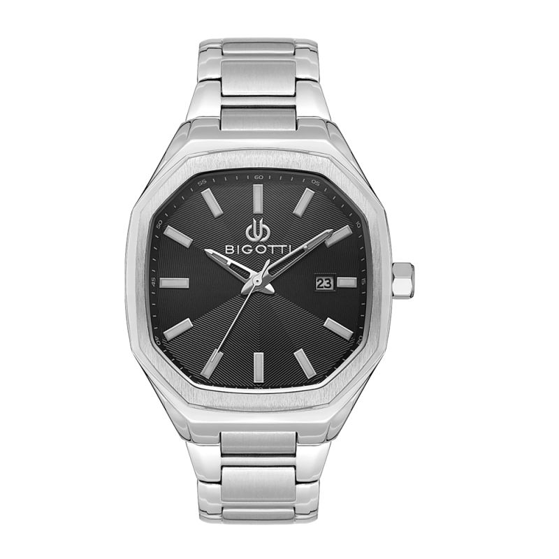 Класически модел мъжки часовник Bigotti с квадратен дизайн. Метален корпус в комбинация с верижка от неръждаема стомана. Черен аналогов дисплей с показател за дата. Стъкло минерал-кристал. Задвижва се от кварцов механизъм. Водоустойчивост 5 ATM - допускат се леки пръски и взимане на душ, не се препоръчва обилно мокрене.