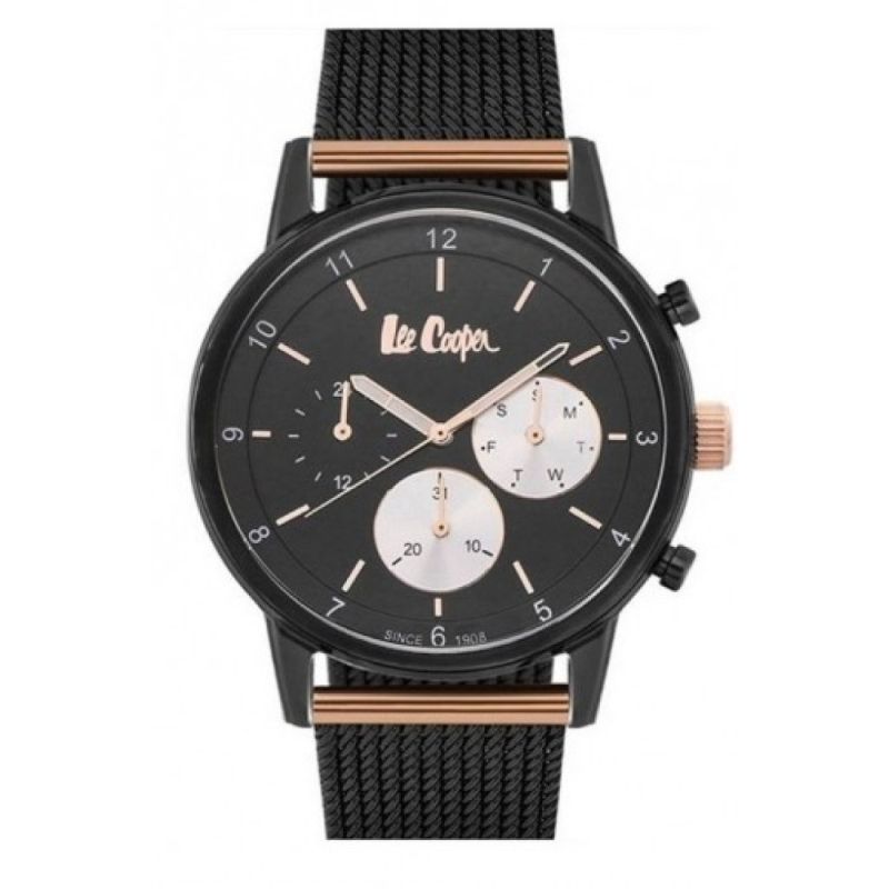 Мъжки часовник Lee Cooper с мултифункционален дисплей. Корпус от супер метал. Верижка от неръждаема стомана. Стъкло минерал-кристал. Кварцов механизъм. Водоустойчивост 3 ATM - допускат се леки пръски, не се препоръчва обилно мокрене.