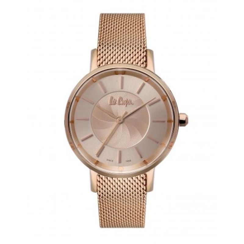 Дамски часовник Lee Cooper с елегантна и модерна визия. Моделът е с корпус изработен от супер метал и има минерално стъкло. Верижка ситна плетка от неръждаема стомана в цвят розово злато. Аналогов дисплей с централна част стил гильош. Кварцов механизъм. Водоустойчивост 3 ATM - допускат се леки пръски, не се препоръчва обилно мокрене.