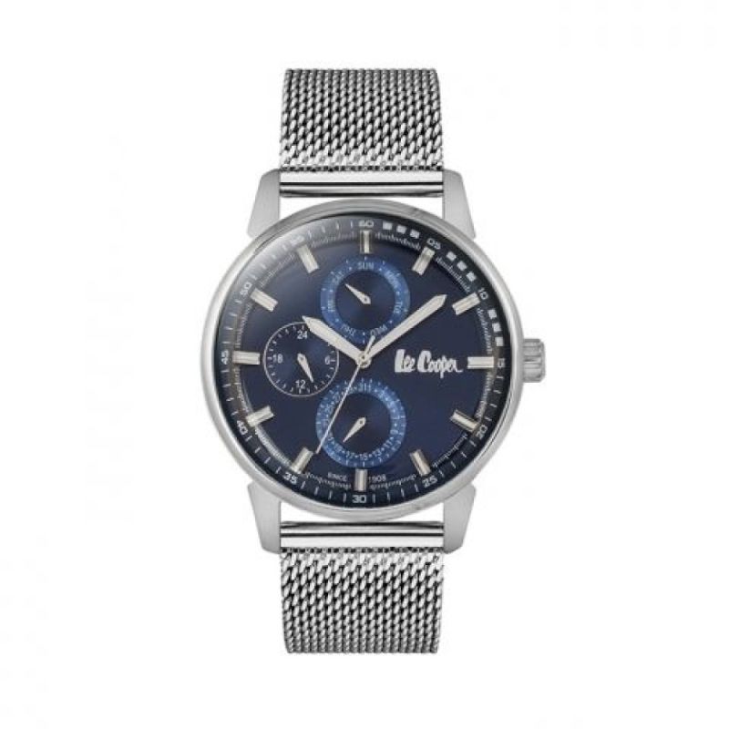 Мъжки часовник Lee Cooper с тъмносин мултифункционален дисплей. Корпус и верижка от супер метал. Стъкло минерал-кристал. Задвижва се от кварцов механизъм. Водоустойчивост 3 ATM - допускат се леки пръски, не се препоръчва обилно мокрене.