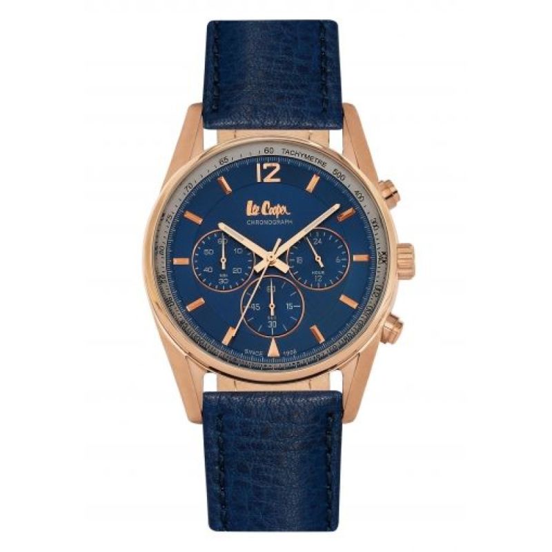Мъжки часовник Lee Cooper с елегантен и модерен дизайн. Моделът е с дисплей тип хронограф в син цвят. Корпус от супер метал и стъкло минерал-кристал. Каишка от естествена кожа. Задвижва се от кварцов механизъм. Водоустойчивост 3 ATM - допускат се леки пръски, не се препоръчва обилно мокрене.