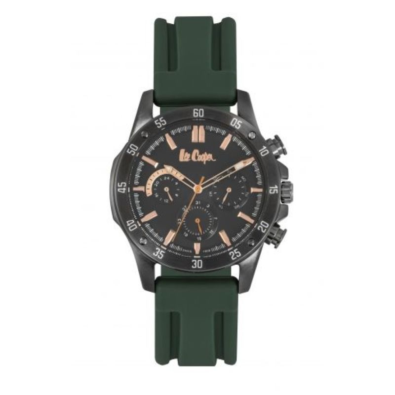Спортен модел мъжки часовник Lee Cooper от колекцията Classic Multifunction. Корпус от супер метал и стъкло минерал-кристал. Тъмнозелена силиконова каишка. Черен мултифункционален дисплей с розово-златисти стрелки и индекси. Задвижва се от кварцов механизъм. Водоустойчивост 3 ATM - допускат се леки пръски, не се препоръчва обилно мокрене.