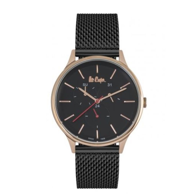 Класически модел мъжки часовник Lee Cooper с мултифункционален дисплей. Корпус от супер метал и стъкло минерал-кристал. Черна верижка със ситна плетка от неръждаема стомана. Задвижва се от кварцов механизъм. Водоустойчивост 3 ATM - допускат се леки пръски, не се препоръчва обилно мокрене.
