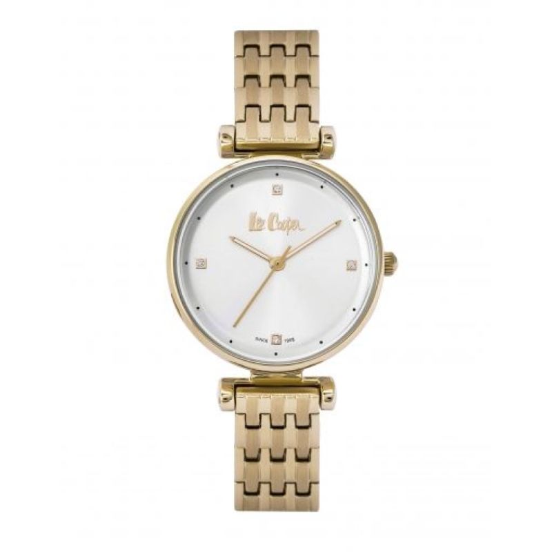Стилен дамски часовник Lee Cooper от колекцията Elegance. Моделът е с корпус от супер метал и има минерално стъкло. Верижка от неръждаема стомана в цвят злато. Сребрист аналогов дисплей с декорация от инкрустирани кристали. Кварцов механизъм. Водоустойчивост 3 ATM - допускат се леки пръски, не се препоръчва обилно мокрене.