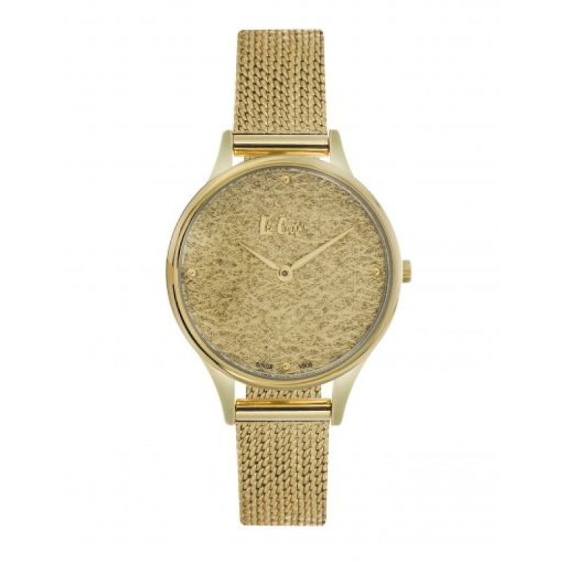 Дамски часовник Lee Cooper със златист циферблат с текстуриран дизайн. Моделът е с корпус от супер метал и има минерално стъкло. Верижка ситна плетка от неръждаема стомана. Аналогов дисплей. Кварцов механизъм. Водоустойчивост 3 ATM - допускат се леки пръски, не се препоръчва обилно мокрене.
