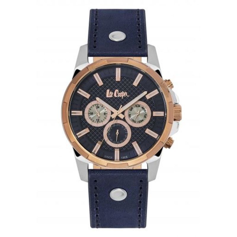 Мъжки спортно-елегантен часовник Lee Cooper със син мултифункционален дисплей. Корпус от супер метал и стъкло минерал-кристал. Каишка от естествена кожа. Кварцов механизъм. Водоустойчивост 3 ATM - допускат се леки пръски, не се препоръчва обилно мокрене.