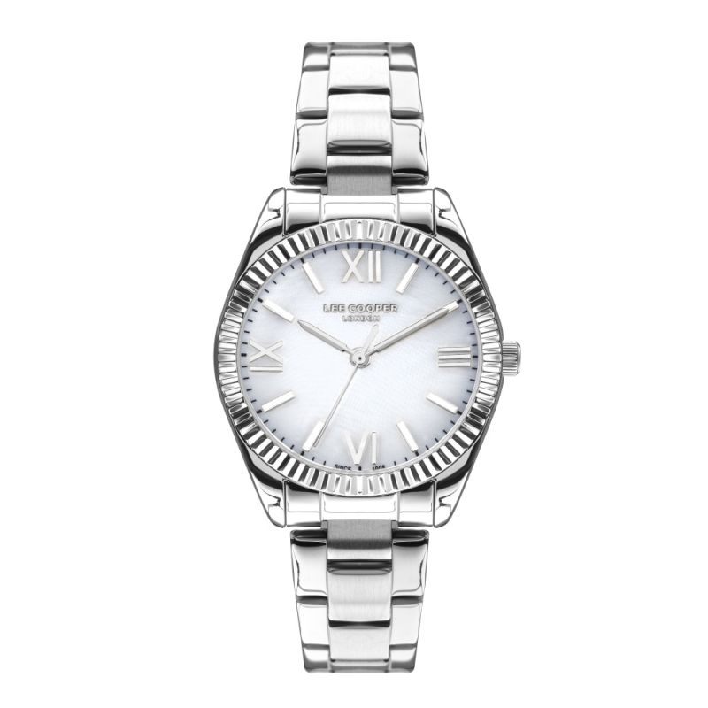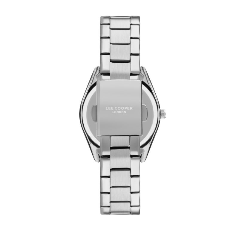 Дамски часовник Lee Cooper със седефен аналогов дисплей със сребристи стрелки и индекси. Моделът е с корпус от супер метал и верижка от неръждаема стомана. Стъкло минерал-кристал. Кварцов механизъм. Водоустойчивост 3 ATM - допускат се леки пръски, не се препоръчва обилно мокрене.