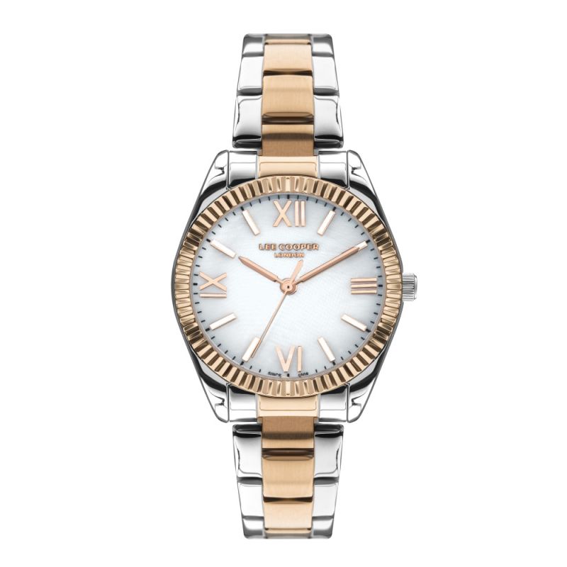 Дамски часовник Lee Cooper със седефен аналогов дисплей с розово-златисти стрелки и индекси. Моделът е с корпус от супер метал и верижка от неръждаема стомана. Стъкло минерал-кристал. Кварцов механизъм. Водоустойчивост 3 ATM - допускат се леки пръски, не се препоръчва обилно мокрене.