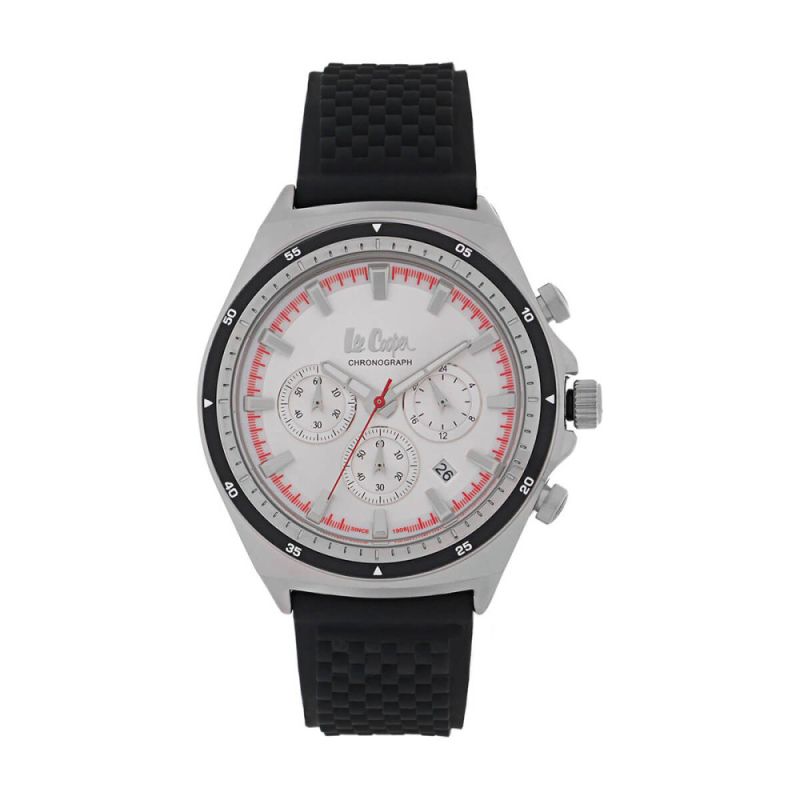 Спортен модел мъжки часовник Lee Cooper със сребрист мултифункционален дисплей. Корпус от супер метал и стъкло минерал-кристал. Черна силиконова каишка. Задвижва се от кварцов механизъм. Водоустойчивост 3 ATM - допускат се леки пръски, не се препоръчва обилно мокрене.