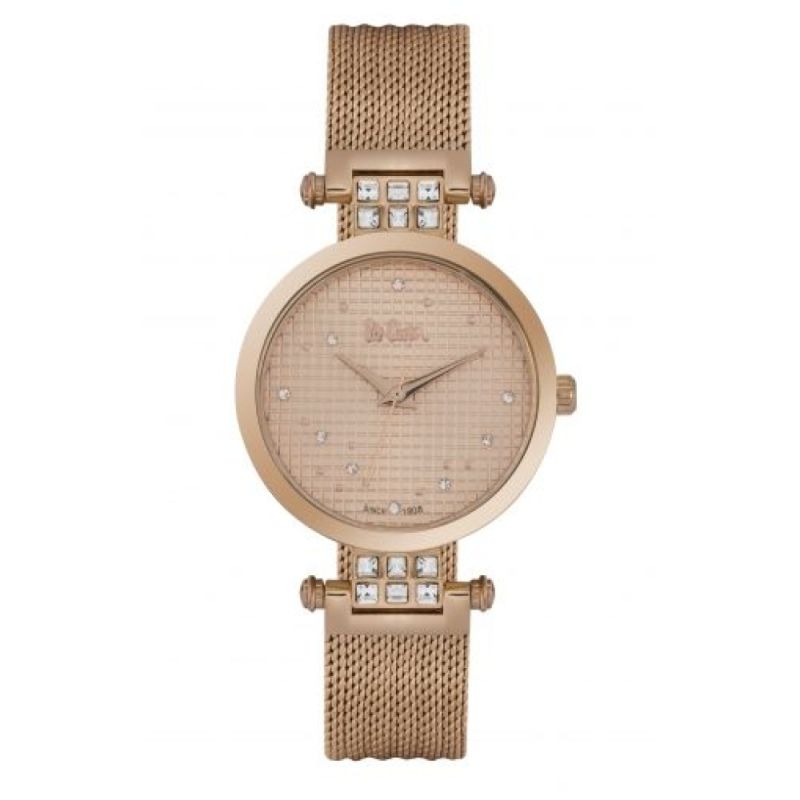 Дамски часовник Lee Cooper от колекцията Elegance. Верижка от неръждаема стомана. Корпус изработен от супер метал. Стъкло минерал-кристал. Аналогов дисплей в цвят розово злато с геометрична основа и нежни кристали. Моделът се задвижва от кварцов механизъм. Водоустойчивост 3 ATM - допускат се леки пръски, не се препоръчва обилно мокрене.