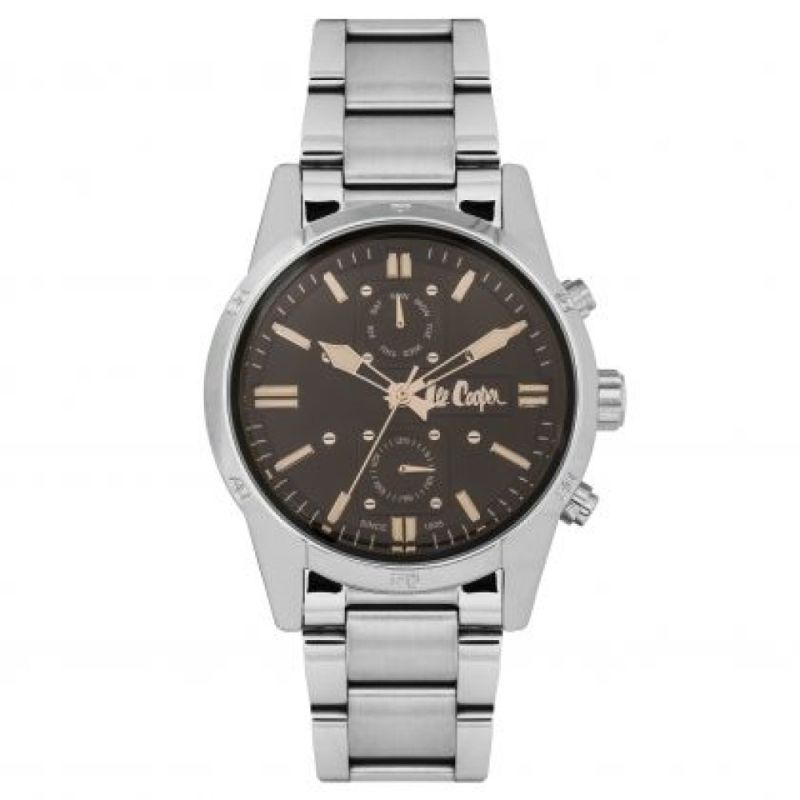Спортен модел мъжки часовник Lee Cooper от колекцията Classic Multifunction. Корпус и верижка от супер метал. Стъкло минерал-кристал. Мултифункционален дисплей с показатели за дата и ден. Задвижва се от кварцов механизъм. Водоустойчивост 3 ATM - допускат се леки пръски, не се препоръчва обилно мокрене.