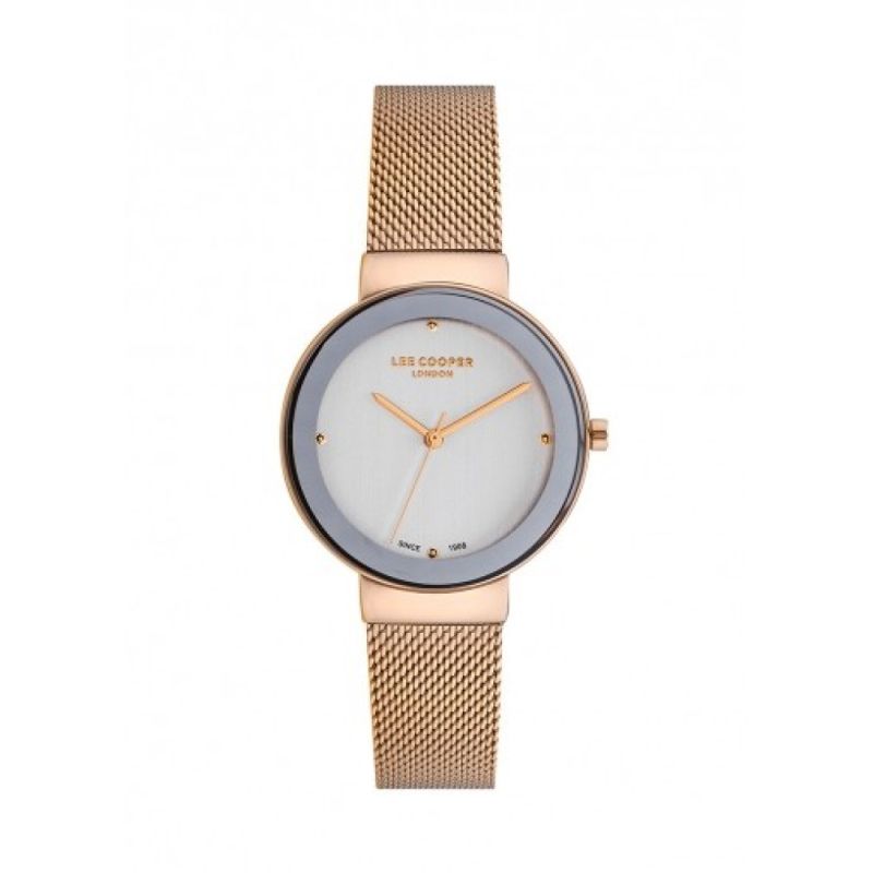 Дамски часовник Lee Cooper с изчистена и стилна визия. Моделът е с меш верижка в цвят розово злато от неръждаема стомана. Корпус от супер метал. Стъкло минерал-кристал. Аналогов дисплей. Кварцов механизъм. Водоустойчивост 3 ATM - допускат се леки пръски, не се препоръчва обилно мокрене.