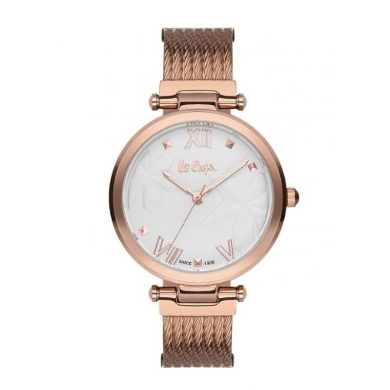 Елегантен дамски часовник Lee Cooper. Моделът е с верижка и корпус от супер метал. Стъкло минерал-кристал. Аналогов дисплей с декорация от релефни цветя и розово-златисти детайли . Задвижва се от кварцов механизъм. Водоустойчивост 3 ATM - допускат се леки пръски, не се препоръчва обилно мокрене.