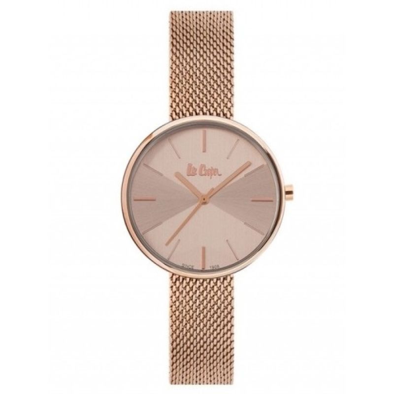Дамски часовник Lee Cooper от колекцията Elegance. Моделът е с бежов аналогов дисплей в съчетание с верижка от неръждаема стомана в цвят розово злато. Корпусът е  изработен от супер метал и е с минерално стъкло. Задвижва се от кварцов механизъм. Водоустойчивост 3 ATM - допускат се леки пръски, не се препоръчва обилно мокрене.
