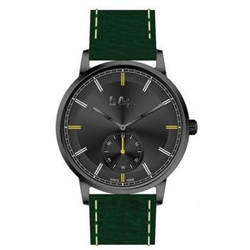 Мъжки часовник Lee Cooper с елегантен дизайн от колекцията Classic. Корпус от супер метал и стъкло минерал-кристал. Тъмнозелена кожена каишка. Черен аналогов дисплей с допълнителен дисплей за секундите. Задвижва се от кварцов механизъм. Водоустойчивост 3 ATM - допускат се леки пръски, не се препоръчва обилно мокрене.