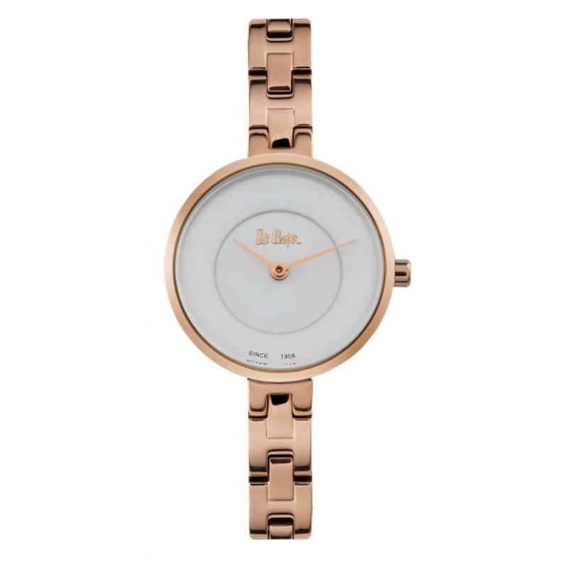 Дамски часовник Lee Cooper с елегантна и изчистена визия. Тънка метална верижка в цвят розово злато. Корпус от специална сплав - супер метал. Стъкло изработено от минерал-кристал. Стилен аналогов дисплей с розово-златисти стрелки. Кварцов механизъм. Водоустойчивост 3 ATM - допускат се леки пръски, не се препоръчва обилно мокрене.