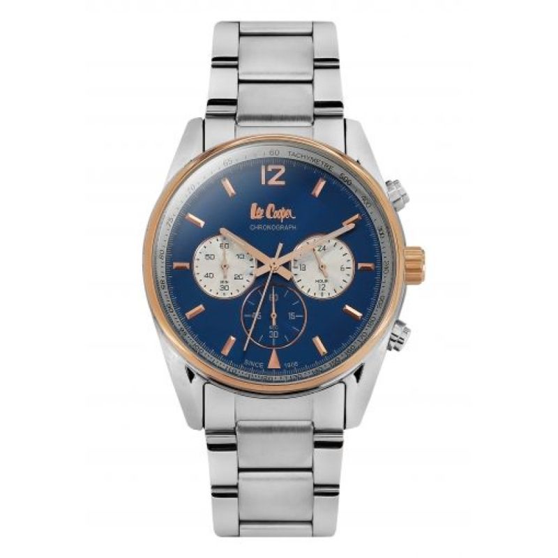 Елегантен мъжки часовник Lee Cooper. Моделът е с дисплей тип хронограф в син цвят. Корпус и верижка от супер метал. Стъкло минерал-кристал. Задвижва се от кварцов механизъм. Водоустойчивост 3 ATM - допускат се леки пръски, не се препоръчва обилно мокрене.