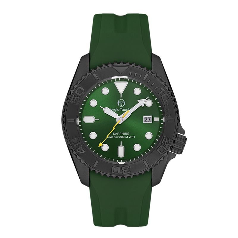 Мъжки часовник Sergio Tacchini с модерна спортна визия от колекцията Dive Star. Корпус от неръждаема стомана в комбинация със силиконова каишка. Зелен аналогов дисплей с показател за дата. Луминисцентно покритие на стрелките и индексите. Стъкло сапфир-кристал. Задвижва се от кварцов механизъм. Водоустойчивост 20 ATM - позволява мокрене, къпане, плуване и гмуркане във водни басейни.