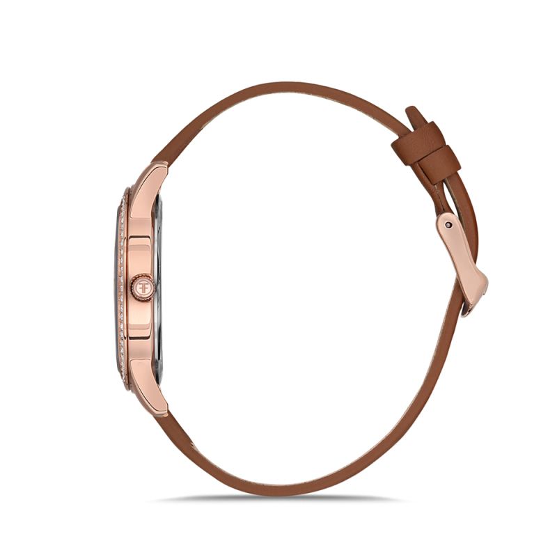 Дамски часовник Freelook с елегантен дизайн от колекцията Belle. Моделът е с декорация от инкрустирани кристали по ринга. Аналогов дисплей с основа логото на марката. Метален корпус в комбинация с каишка от естествена кожа. Кварцов механизъм. Водоустойчивост 5 ATM - допускат се леки пръски и взимане на душ, не се препоръчва обилно мокрене.