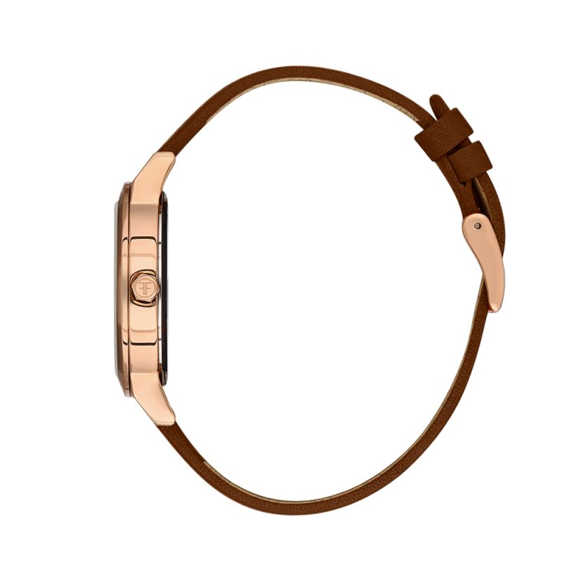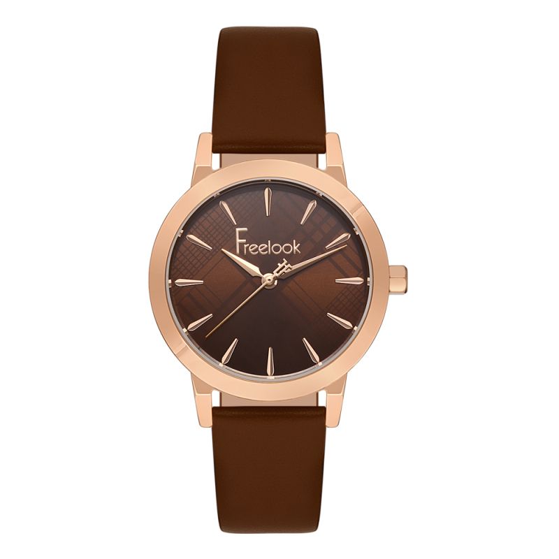 Дамски часовник Freelook с метален корпус и каишка от естествена кожа. Кафяв аналогов дисплей. Стъкло минерал-кристал. Задвижва се от кварцов механизъм. Водоустойчивост 5 ATM - допускат се леки пръски и взимане на душ, не се препоръчва обилно мокрене.