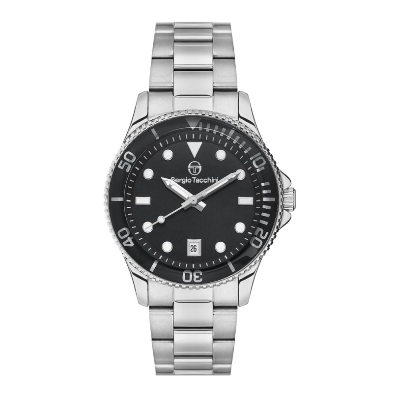 Дамски часовник Sergio Tacchini с корпус и верижка от неръждаема стомана. Черен аналогов дисплей с показател за дата. Луминисцентно покритие на стрелките и индексите. Стъкло минерал-кристал. Моделът се задвижва от кварцов механизъм. Водоустойчивост 5 ATM - допускат се леки пръски и взимане на душ, не се препоръчва обилно мокрене.
