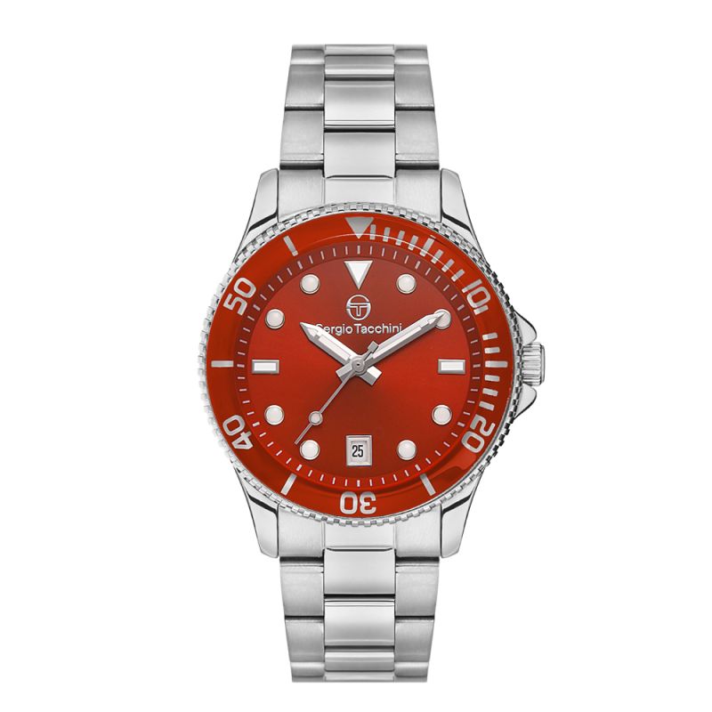 Дамски часовник Sergio Tacchini с корпус и верижка от неръждаема стомана. Червен аналогов дисплей с показател за дата. Луминисцентно покритие на стрелките и индексите. Стъкло минерал-кристал. Моделът се задвижва от кварцов механизъм. Водоустойчивост 5 ATM - допускат се леки пръски и взимане на душ, не се препоръчва обилно мокрене.