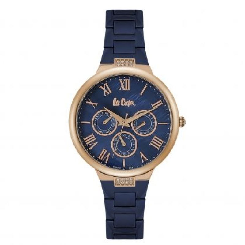 Дамски часовник Lee Cooper. Моделът е с корпус и верижка изработени от специална сплав - супер метал. Стъкло минерал-кристал. Мултифункционален седефен дисплей с показатели за дата, ден от седмицата и 24 часов формат. Задвижва се от кварцов механизъм. Водоустойчивост 3 ATM - допускат се леки пръски, не се препоръчва обилно мокрене.