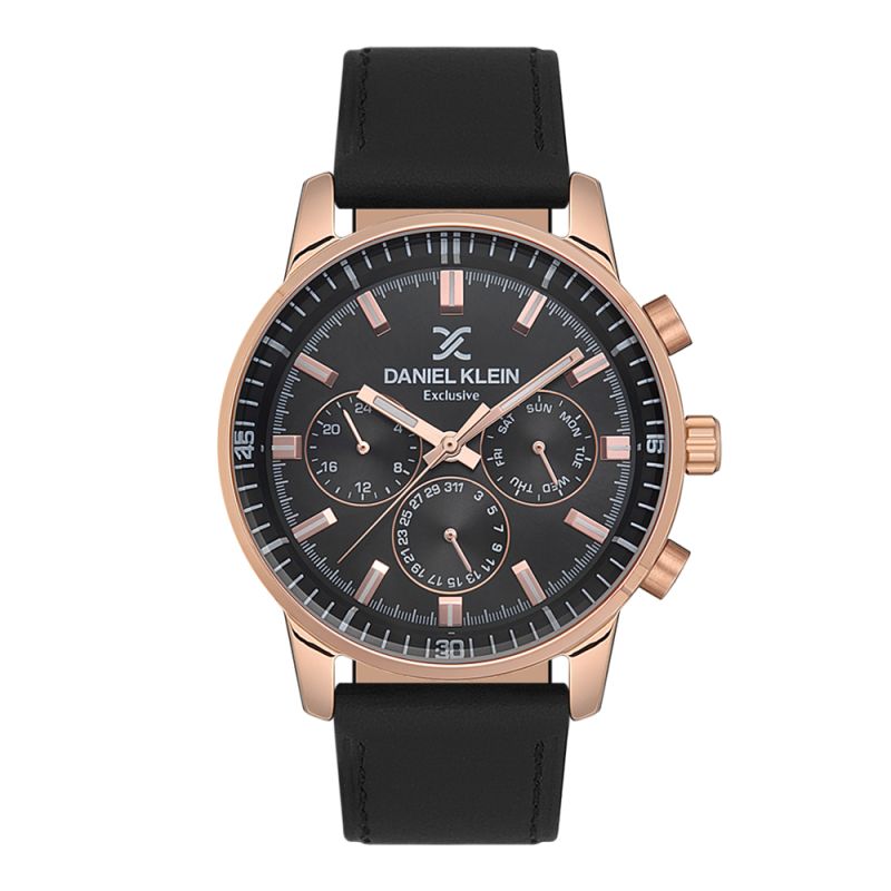 Спортно-елегантен мъжки часовник Daniel Klein с мултифункционален дисплей от колекцията Exclusive. Метален корпус, съчетан с кожена каишка. Минерално стъкло устойчиво към надраскване. Задвижва се от кварцов механизъм. Водоустойчивост 5 ATM - допускат се леки пръски и взимане на душ, не се препоръчва обилно мокрене.