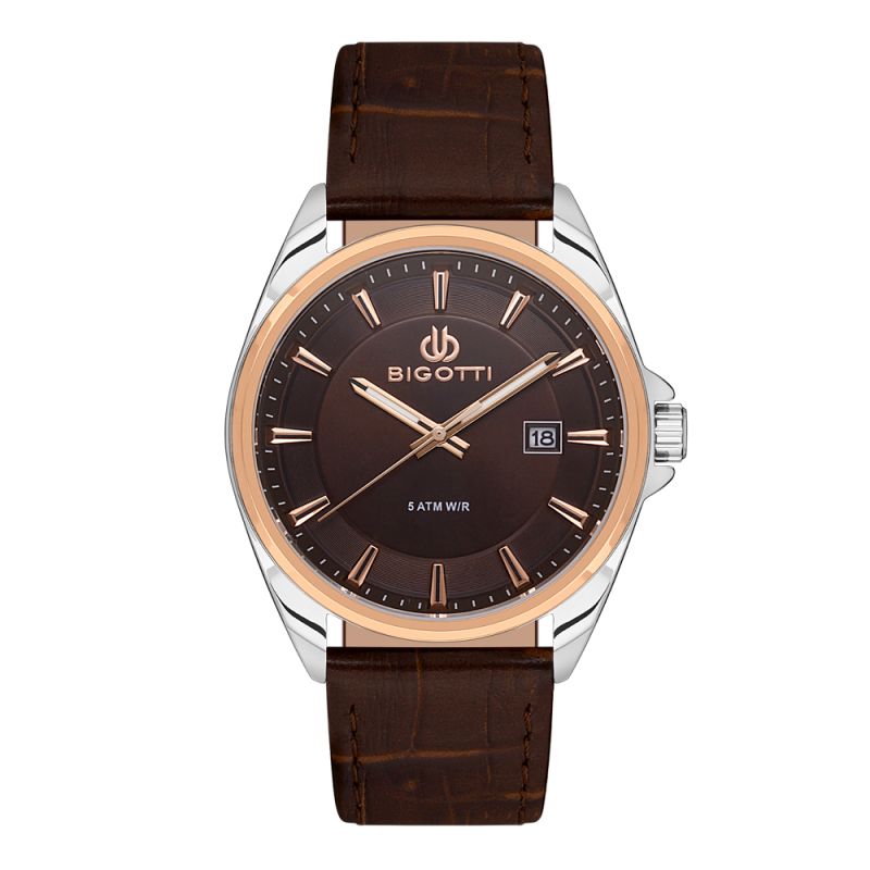 Стилен мъжки часовник Bigotti с метален корпус и каишка от естествена кожа. Кафяв аналогов дисплей с детайли в цвят розово злато и показател за дата. Минерално стъкло, устойчиво на надраскване. Кварцов механизъм. Водоустойчивост 5 ATM - допускат се леки пръски и взимане на душ, не се препоръчва обилно мокрене.