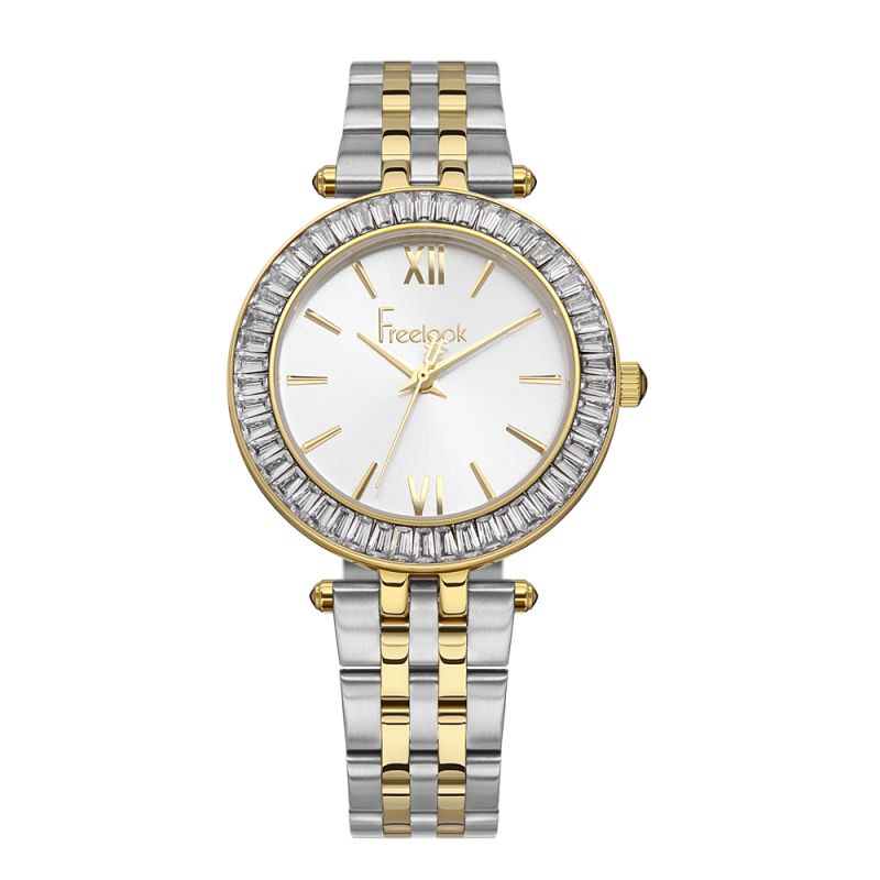 Елегантен дамски часовник Freelook от серията Charmant. Моделът е със сребрист аналогов дисплей с детайли в цвят злато. Декорация от камъни по безела. Метален корпус в комбинация с верижка от неръждаема стомана. Стъкло минерал-кристал. Задвижва се от кварцов механизъм. Водоустойчивост 5 ATM - допускат се леки пръски и взимане на душ, не се препоръчва обилно мокрене.