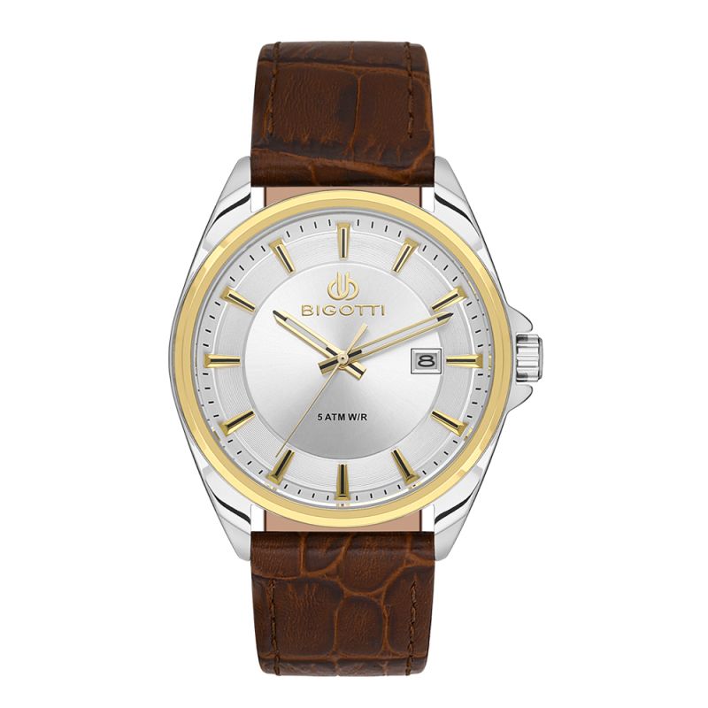 Стилен мъжки часовник Bigotti с метален корпус и каишка от естествена кожа. Сребрист аналогов дисплей с детайли в цвят злато и показател за дата. Минерално стъкло, устойчиво на надраскване. Кварцов механизъм. Водоустойчивост 5 ATM - допускат се леки пръски и взимане на душ, не се препоръчва обилно мокрене.