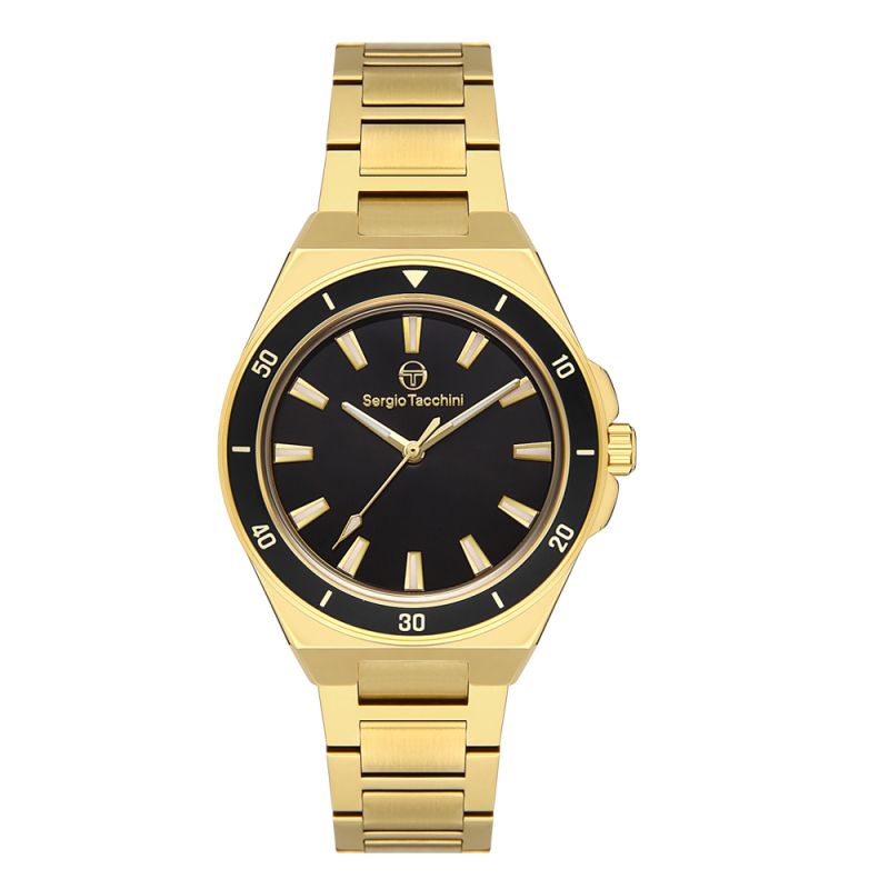 Класически модел дамски часовник Sergio Tacchini с модерен дизайн. Корпус и верижка от неръждаема стомана. Аналогов дисплей в черен цвят. Луминисцентно покритие на стрелките и индексите. Минерално стъкло, устойчиво на надраскване. Кварцов механизъм. Водоустойчивост 5 ATM - допускат се леки пръски и взимане на душ, не се препоръчва обилно мокрене.