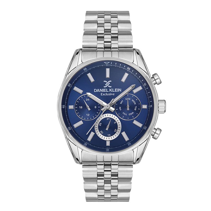 Мъжки часовник Daniel Klein със спортно-ежедневен дизайн от колекцията Exclusive. Корпус изработен от висококачествена метална сплав. Верижка от неръждаема стомана. Син мултифункционален дисплей със сребристи детайли. Луминисцентно покритие на стрелките и индексите. Минерално стъкло устойчиво към надраскване. Кварцов механизъм. Водоустойчивост 5 ATM - допускат се леки пръски и взимане на душ, не се препоръчва обилно мокрене.
