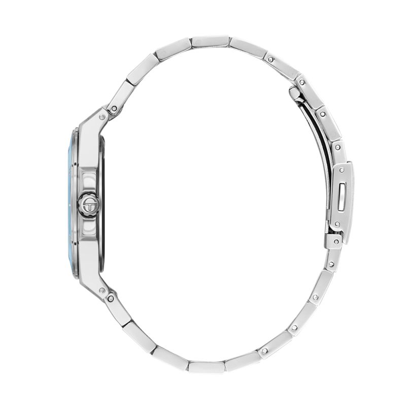 Класически модел дамски часовник Sergio Tacchini с модерен дизайн. Корпус и верижка от неръждаема стомана. Син аналогов дисплей. Луминисцентно покритие на стрелките и индексите. Минерално стъкло, устойчиво на надраскване. Кварцов механизъм. Водоустойчивост 5 ATM - допускат се леки пръски и взимане на душ, не се препоръчва обилно мокрене.