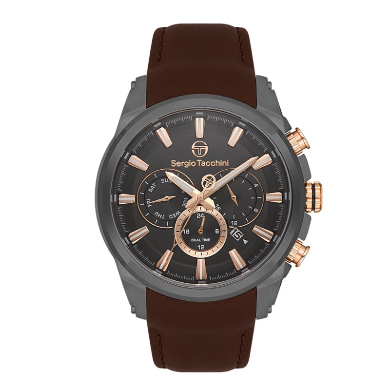 Спортно-елегантен мъжки часовник Sergio Tacchini. Корпус от неръждаема стомана в комбинация с кожена каишка. Мултифункционален дисплей с показатели за дата, ден и двойно време. Минерално стъкло, устойчиво на надраскване. Задвижва се от кварцов механизъм. Водоустойчивост 5 ATM - допускат се леки пръски и взимане на душ, не се препоръчва обилно мокрене.