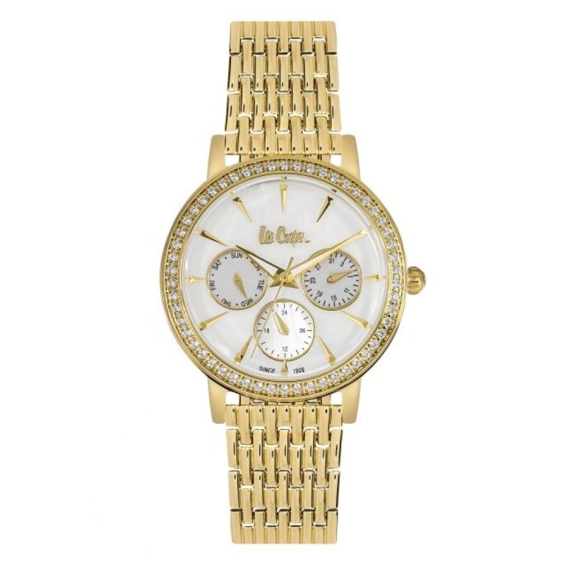 Елегантен дамски часовник Lee Cooper с мултифункционален дисплей и декорация от инкрустирани кристали върху ринга. Моделът е с корпус и верижка изработени от специална сплав - супер метал. Стъклото е минерал-кристал. Задвижва се от кварцов механизъм. Водоустойчивост 3 ATM - допускат се леки пръски, не се препоръчва обилно мокрене.