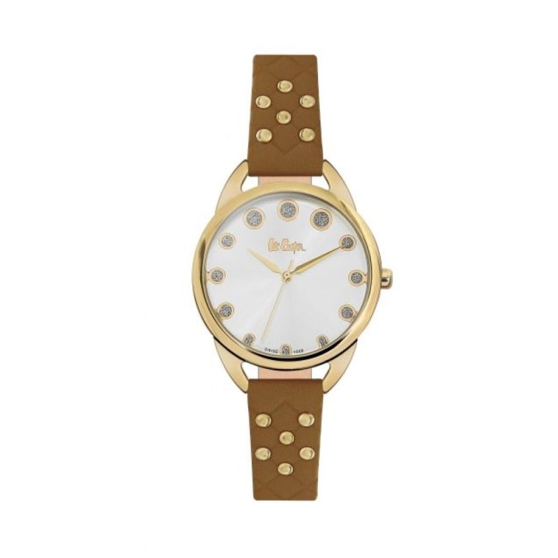 Дамски часовник Lee Cooper от колекцията Elegance. Корпус изработен от специална сплав - супер метал. Стъкло минерал-кристал. Кафява кожена каишка с метални акценти. Аналогов дисплей с декорация от блестящи елементи на часовите маркери. Кварцов механизъм. Водоустойчивост 3 ATM - допускат се леки пръски, не се препоръчва обилно мокрене.