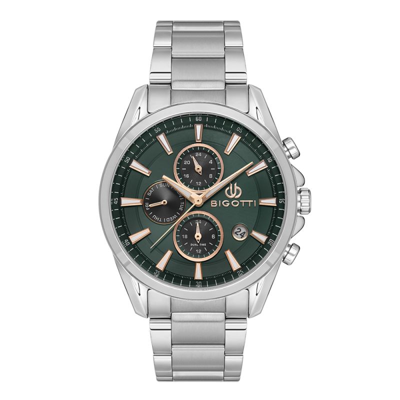 Спортно-елегантен мъжки часовник Bigotti с мултифункционален дисплей. Луминисцентно покритие на стрелките и индексите. Минерално стъкло, устойчиво на надраскване. Моделът е с метален корпус и верижка от неръждаема стомана. Задвижва се от кварцов механизъм. Водоустойчивост 5 ATM - допускат се леки пръски и взимане на душ, не се препоръчва обилно мокрене.