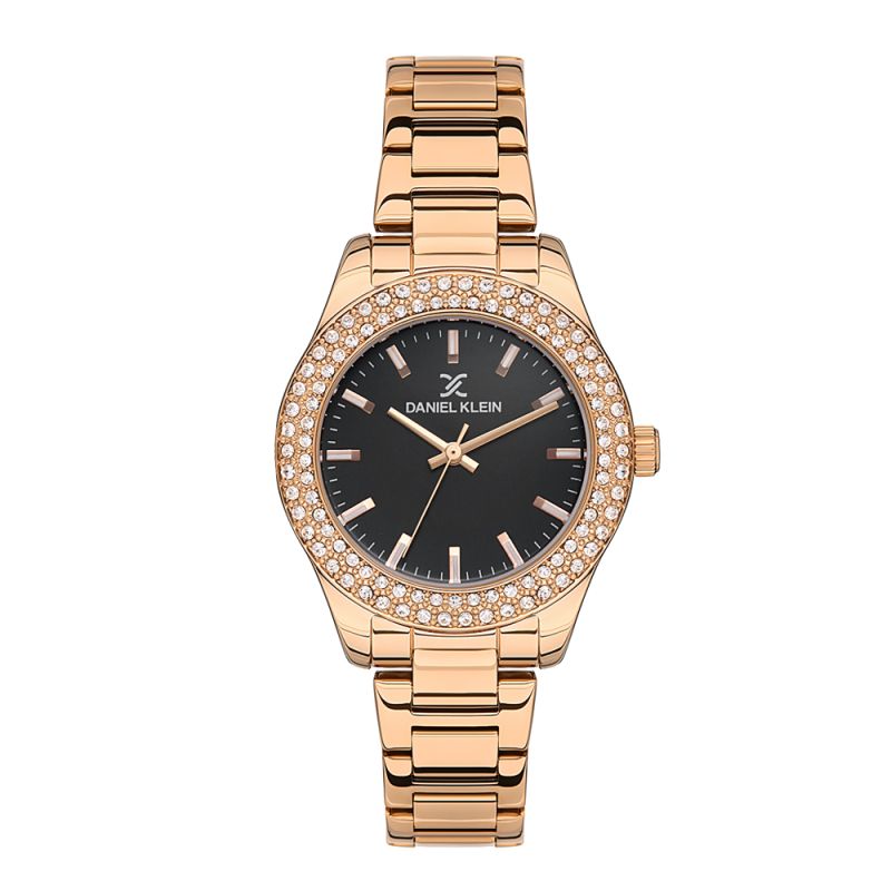 Дамски часовник Daniel Klein с елегантна и модерна визия от колекцията Premium. Стилен аналогов дисплей с богата декорация от нежни кристали по безела. Стъкло минерал-кристал. Метален корпус съчетан с верижка от неръждаема стомана. Задвижва се от кварцов механизъм. Водоустойчивост 3 ATM - допускат се леки пръски, не се препоръчва обилно мокрене.