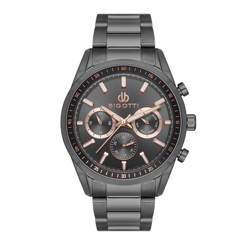 Мъжки часовник Bigotti с модерна спортно-елегантна визия. Мултифункционален дисплей с детайли в цвят розово злато. Луминисцентно покритие на стрелките и индексите. Минерално стъкло, устойчиво на надраскване. Метален корпус, съчетан с верижка от неръждаема стомана. Задвижва се от кварцов механизъм. Водоустойчивост 5 ATM - допускат се леки пръски и взимане на душ, не се препоръчва обилно мокрене.