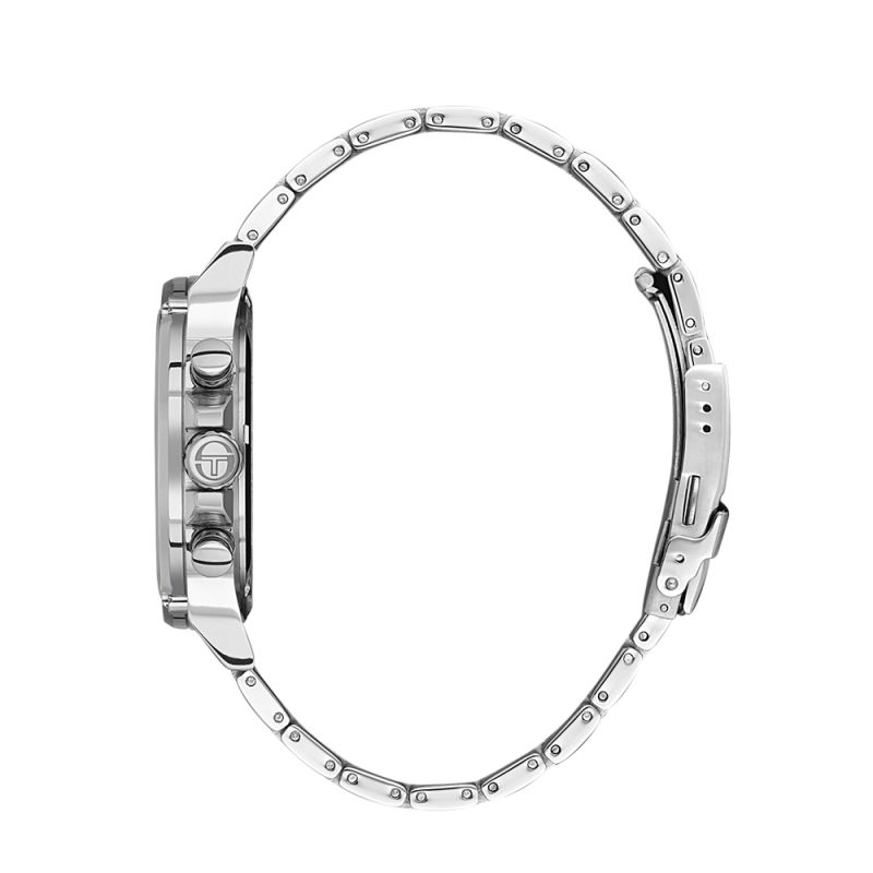 Мъжки часовник Sergio Tacchini с мултифункционален дисплей. Моделът е с корпус и верижка изработени от неръждаема стомана. Минерално стъкло, устойчиво на надраскване. Задвижва се от кварцов механизъм. Водоустойчивост 5 ATM - допускат се леки пръски и взимане на душ, не се препоръчва обилно мокрене.