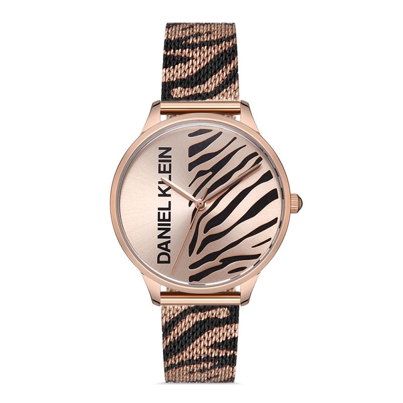Дамски часовник Daniel Klein от колекцията Premium. Аналогов дисплей с интересен дизайн. Стъкло минерал-кристал. Моделът е с меш верижка от неръждаема стомана и метален корпус. Задвижва се от кварцов механизъм. Водоустойчивост 3 ATM - допускат се леки пръски, не се препоръчва обилно мокрене.