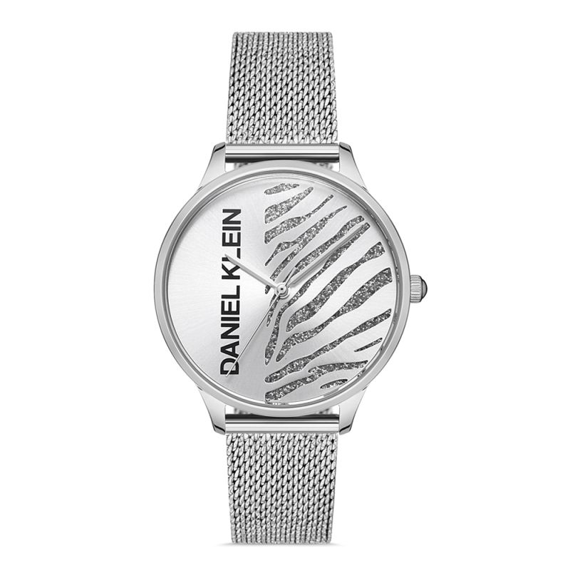 Дамски часовник Daniel Klein от колекцията Premium. Сребрист аналогов дисплей с интересен дизайн и бляскави детайли. Стъкло минерал-кристал. Моделът е с меш верижка от неръждаема стомана и метален корпус. Кварцов механизъм. Водоустойчивост 3 ATM - допускат се леки пръски, не се препоръчва обилно мокрене.