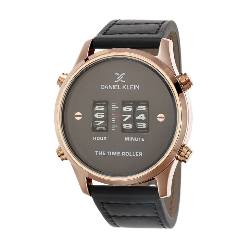 Спортно-елегантен мъжки часовник Daniel Klein от колекцията Premium. Аналогов дисплей с интересен дизайн Time roller. Стъкло минерал-кристал. Корпус от висококачествена метална сплав. Черна кожена каишка. Кварцов механизъм. Водоустойчивост 5 ATM - допускат се леки пръски и взимане на душ, не се препоръчва обилно мокрене.