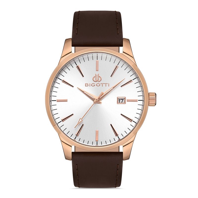 Eлегантен мъжки часовник Bigotti от колекцията Napoli. Стилен аналогов дисплей с показател за дата. Минерално стъкло, устойчиво на надраскване. Метален корпус в комбинация с каишка от естествена кожа. Моделът се задвижва от кварцов механизъм. Водоустойчивост 5 ATM - допускат се леки пръски и взимане на душ, не се препоръчва обилно мокрене.