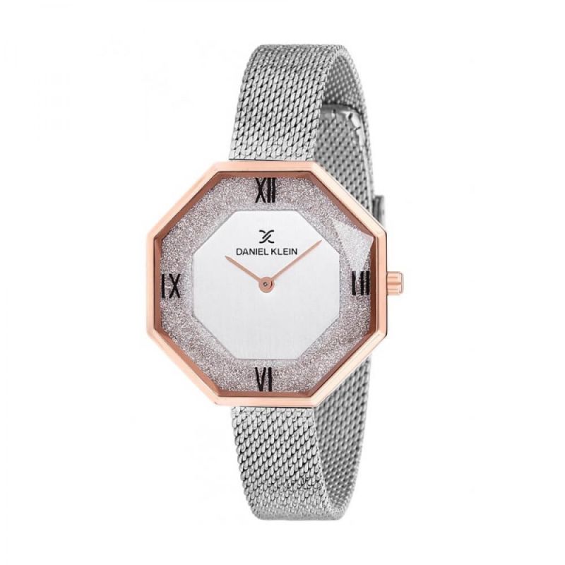 Дамски часовник Daniel Klein от колекцията Trendy. Бляскав аналогов дисплей. Стъкло минерал-кристал. Осмоъгълен корпус изработен от висококачествен метал. Верижка от неръждаема стомана. Часовникът се задвижва от кварцов механизъм. Водоустойчивост 3 ATM - допускат се леки пръски, не се препоръчва обилно мокрене.