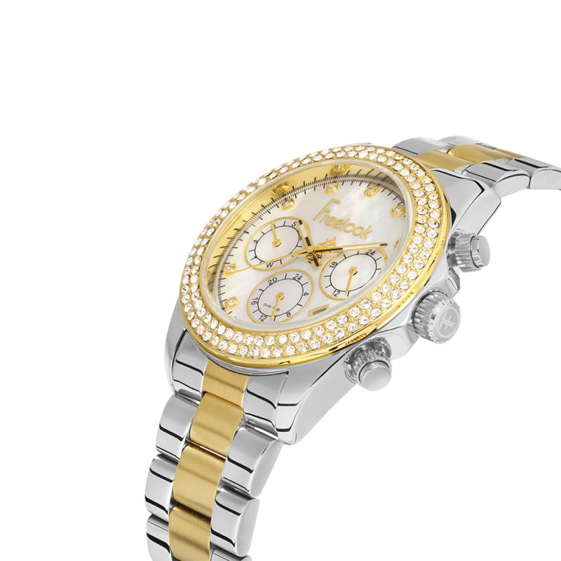 Дамски часовник Freelook от колекцията Charmant. Моделът е със седефен мултифункционален дисплей и богата декорация от нежни кристали. Стъкло минерал-кристал. Метален корпус в комбинация с верижка от неръждаема стомана. Задвижва се от кварцов механизъм. Водоустойчивост 5 ATM - допускат се леки пръски и взимане на душ, не се препоръчва обилно мокрене.